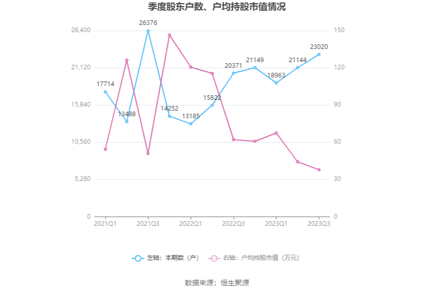 筹码集中度方面,截至2023年三季度末,公司股东总户数为2.3万户,较上半年末增长了1876户,增幅8.87%;户均持股市值由上半年末的44.29万元下降至37.86万元,降幅为14.52%。