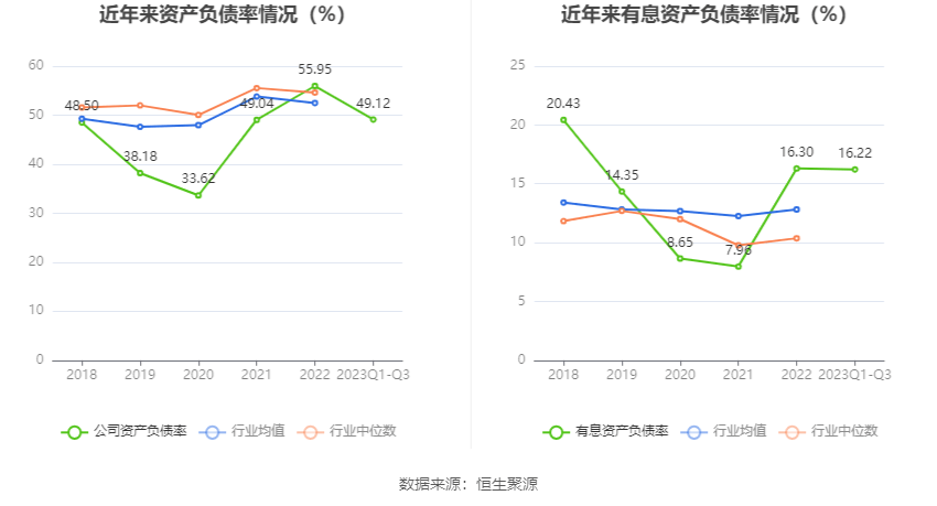 在偿债能力方面,公司2023年三季度末资产负债率为49.12%,相比上年末下降6.83个百分点;有息资产负债率为16.22%,相比上年末下降0.08个百分点。