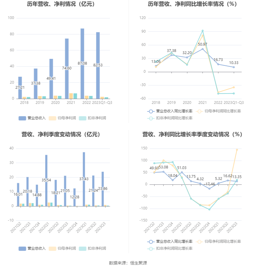 根据三季报,公司第三季度实现营业总收入23.86亿元,同比增长13.35%,环比增长12.34%;归母净利润8002.99万元,同比增长144.76%,环比增长61.02%;扣非净利润3355.13万元,同比增长19.45%,环比下降22.30%。