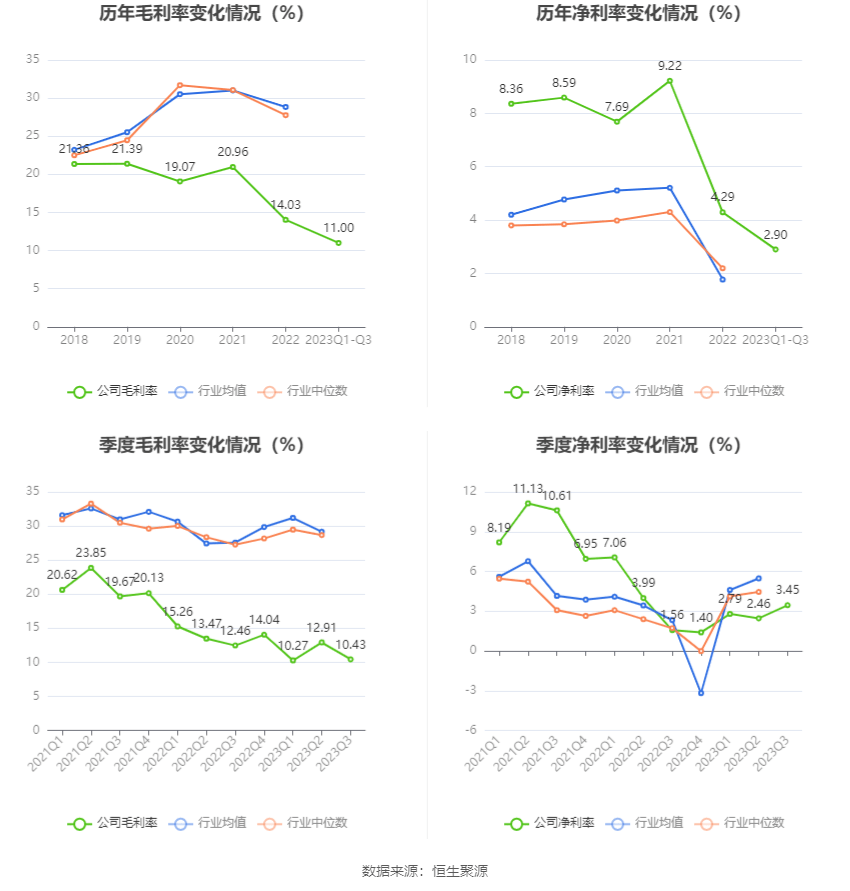 2023年前三季度,公司毛利率为11.00%,同比下降3.03个百分点;净利率为2.90%,较上年同期下降1.86个百分点。从单季度指标来看,2023年第三季度公司毛利率为10.43%,同比下降2.03个百分点,环比下降2.48个百分点;净利率为3.45%,较上年同期上升1.89个百分点,较上一季度上升0.99个百分点。