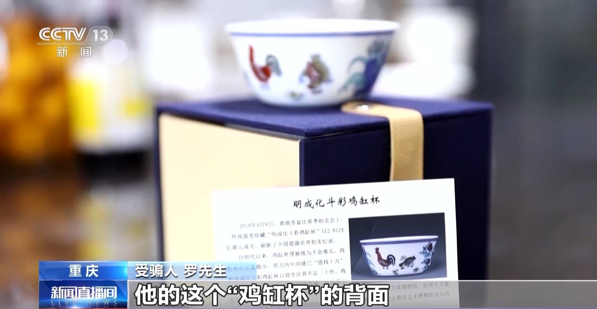 受骗人 罗先生:“鸡缸杯”的背面打了大明成化年间,当时就感觉不可能是大明成化年间的东西,感觉是假的,但是想到几十块钱买的,也就没找他退了。