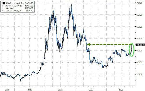 主流加密货币连续两日普涨。市值最大的龙头比特币隔夜涨10%创一年来最大涨幅,并在去年5月初以来首次升破3.5万美元,周二交投3.4万美元且涨幅收窄至3%,有分析称,这主要是现货比特币ETF获批的希望增大,令币圈空头回补、遭遇轧空而推涨价格,比特币已在年内翻倍。