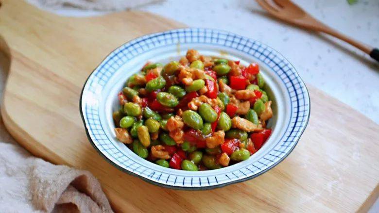 再放毛豆一起翻炒至毛豆变碧绿。