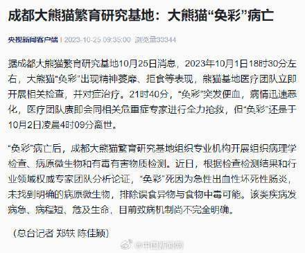 “奂彩”病亡后,成都大熊猫繁育研究基地组织专业机构开展组织病理学检查、病原微生物和有毒有害物质检测。近日,根据检查检测结果和行业领域权威专家团队分析论证,“奂彩”死因为急性出血性坏死性肠炎,未找到明确的病原微生物,排除误食异物与食物中毒可能。该类疾病发病急、病程短、危及生命,目前致病机制尚不完全明确。