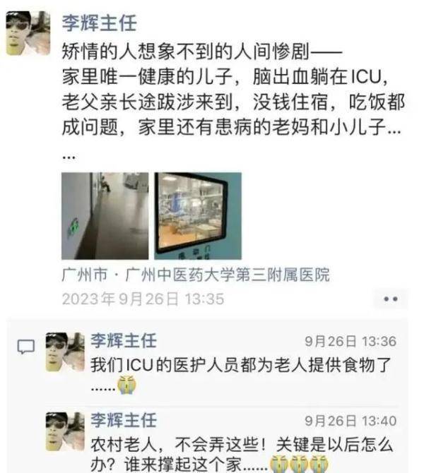面对老人讲述,在ICU见惯生死的医护人员一下子泪目了。他们自发地为老人家提供餐饮,在家属接待室没有接待家属的时候,请他在里面休息。在ICU主任李辉在社交媒体上发了一条朋友圈后,医院同事及主任身边亲友纷纷伸出援手,尽自己的绵薄之力,帮助这一家人。ICU医护人员将筹集到的善款存进患者的住院押金,等出院时给到家属。医院饭堂主动承担了老人的三餐,急诊留观病房腾出一张病床给老人过夜。