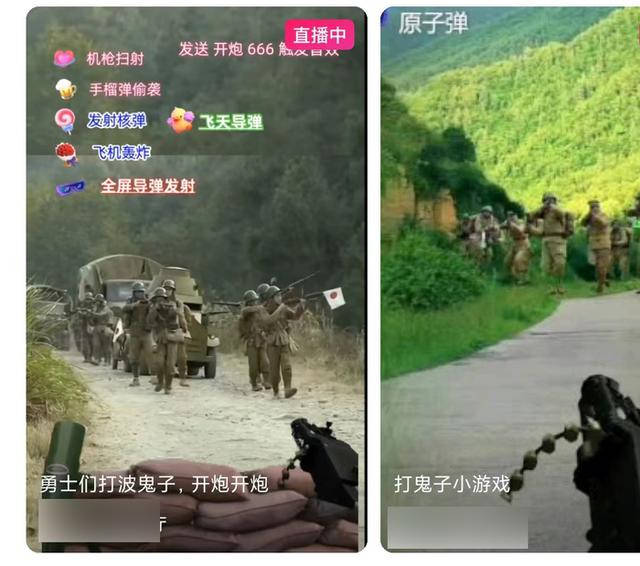 所谓的“直播打鬼子”,其实就是将抗日题材影视作品剪辑一下,配上《鬼子进村曲》的音乐,主播会诱导网友刷出相应的“礼物”——“机枪扫射”“投扔手雷”“飞机轰炸”等,视频上就会出现相应的特效,屏幕上的“鬼子”也会成排倒下,跟一些战斗类的电子游戏差不多,靠着渲染气氛,煽动情绪。当然,这些礼物都是要钱买的。