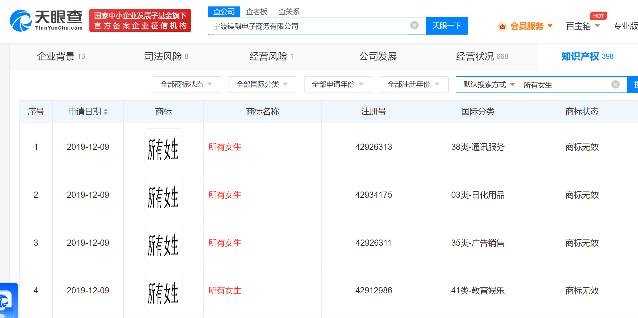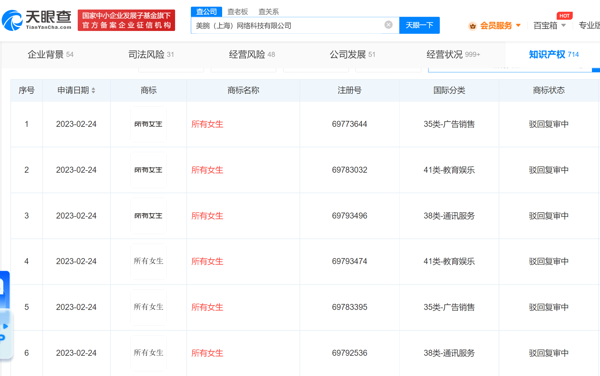 天眼查App显示,由李佳琦和美腕共同持股的宁波镁麒电子商务有限公司,曾在2019年12月申请注册多枚“所有女生”商标,国际分类包括广告销售、日化用品等,当前上述商标均被驳回,处于无效状态。今年2月,美腕(上海)网络科技有限公司申请多枚“所有女生”商标,当前商标状态也均为驳回复审中。据悉,“所有女生”为李佳琦口头禅。