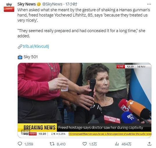 报道称,获释人质之一,85岁的约赫夫德·利夫希茨(Yocheved Lifshitz)在被移交时,和哈马斯蒙面武装人员握手。当地时间周二的新闻发布会上,她解释称此举是因为“哈马斯对待人质非常友善”。