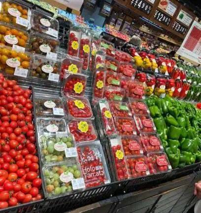 超市里用一次性塑料包装的各种果蔬蔬菜