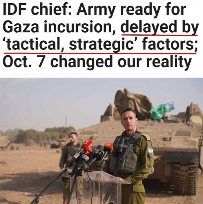 《以色列时报》当地时间24日援引军方消息称,以色列国防军总参谋长赫尔齐·哈勒维当天在加沙地带附近举行的新闻发布会上承认,目前出于“战略考虑”而推迟了地面进攻。