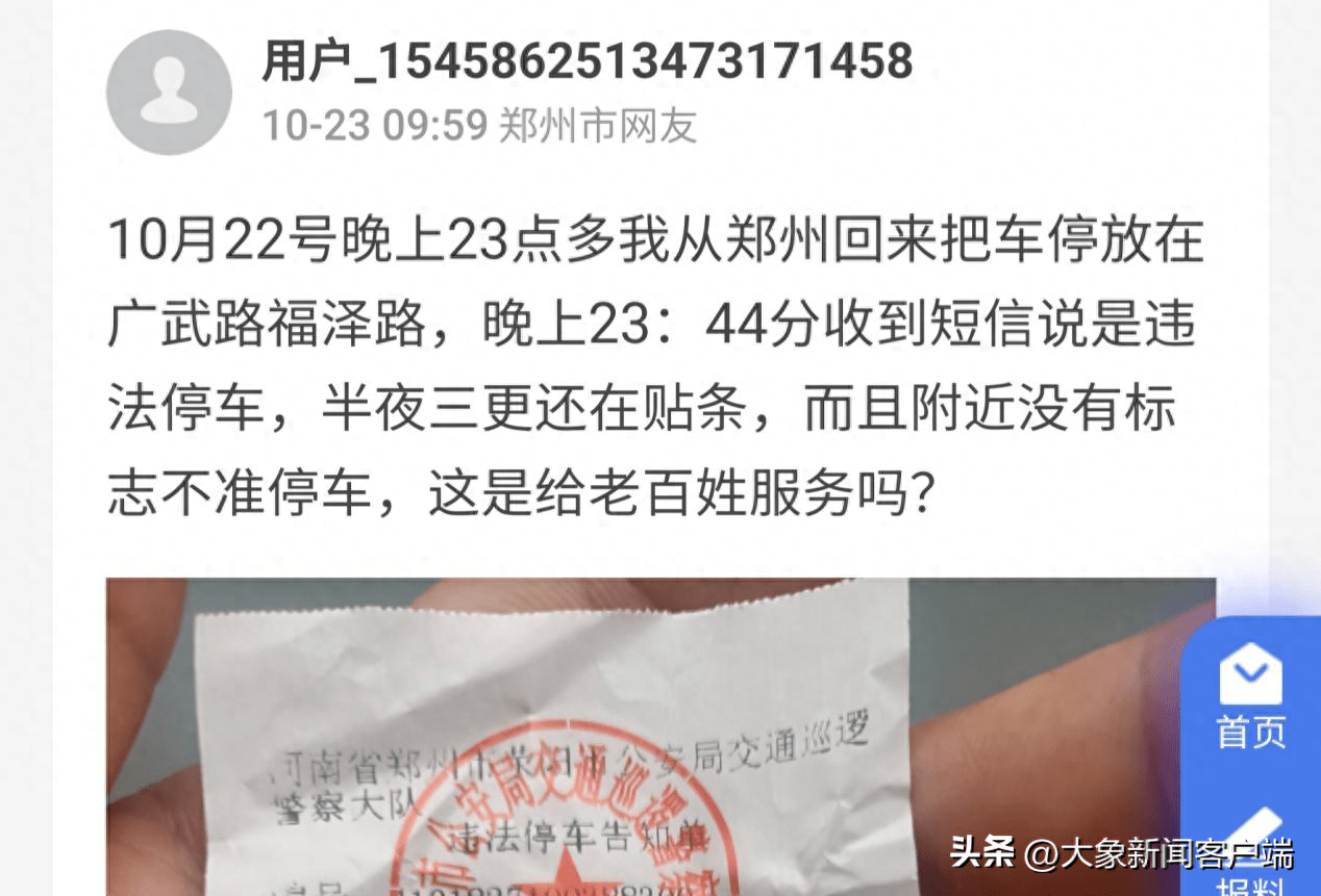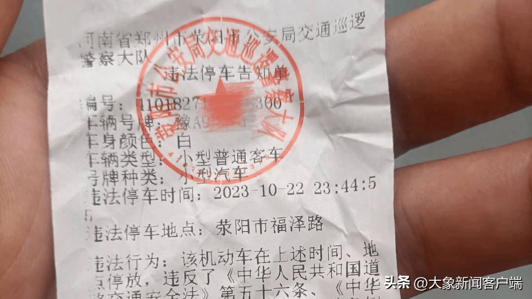 10月23日,有郑州市网友曹先生向大象新闻·大象帮报料称,自己晚上11点多把车停在了广武路福泽路,收到了违停的短信提示后当时就挪了车,但第二天早上发现依然被贴了罚单,他对交警当晚的执法有异议。
