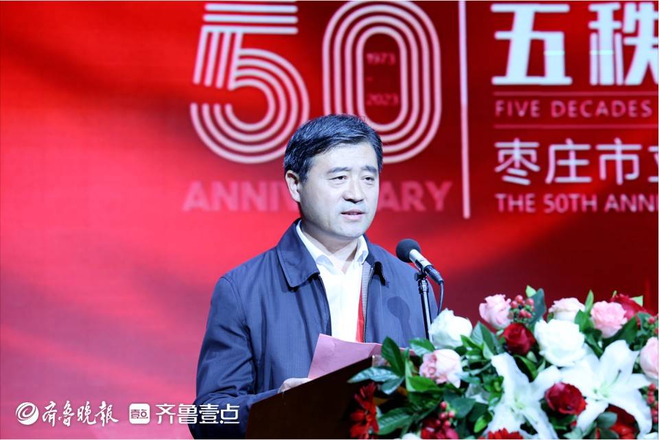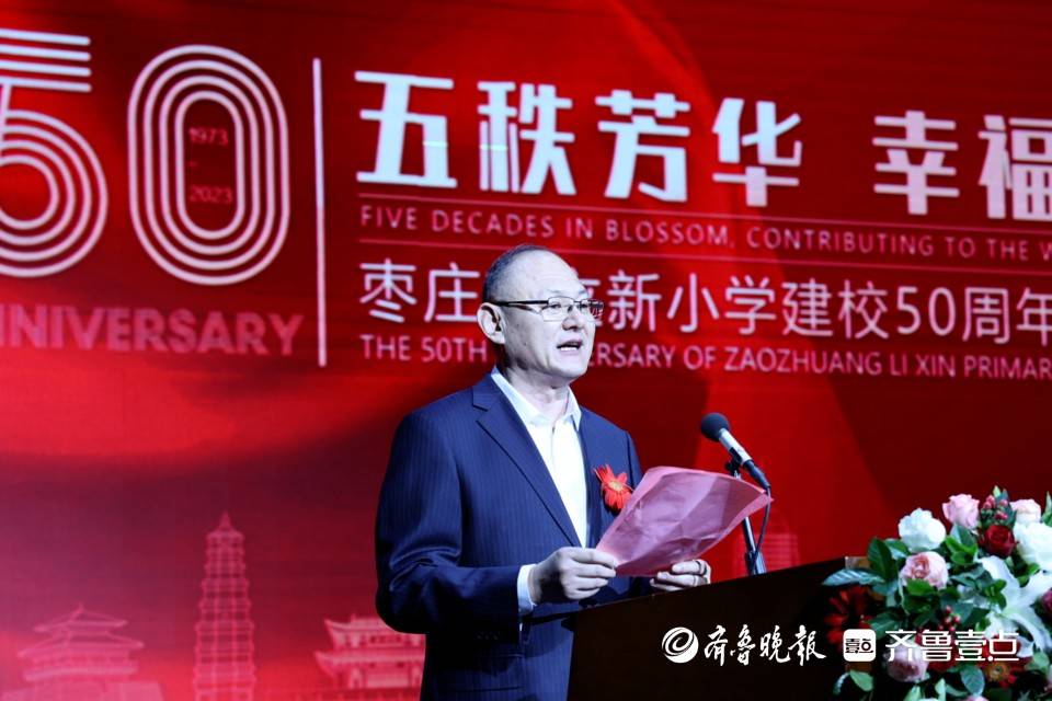 枣庄市教育局党组成员、副局长王明成对立新小学建校50周年表示热烈祝贺。他表示,立新人五十年以来孜孜以求绘就了立新小学熠熠生辉的历史长卷,长卷上的每一页都记录着立新小学不忘初心、追求卓越、奋发图强的坚定步履,每一页都书写着一代代立新人牢记使命、开拓进取、奋勇争先的壮志豪情,五十年来立新学子置身于国内外各个行业,自觉投身于社会经济发展,给立新小学留下了丰厚的财富。今天的立新小学“一校四区”,校园环境优美,文化气息浓厚,教学条件先进,师资力量精良,办学特色鲜明,教育教学质量不断提升,受到社会各界的一致好评。