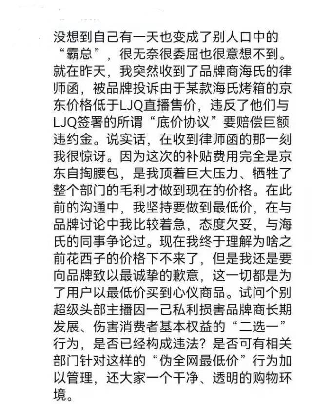 该工作人员称,收到海氏的律师函,被品牌投诉由于某款海氏烤箱的京东价格低于李佳琦直播售价,违反了他们与李佳琦签署的“底价协议”,并要求赔偿巨额违约金。
