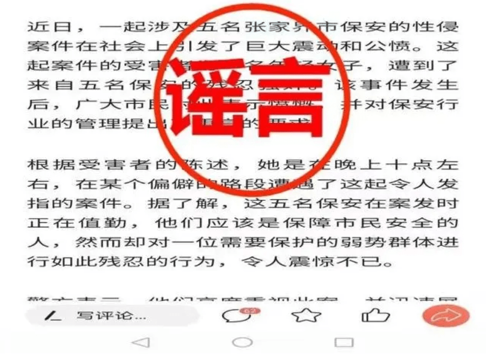 2023年10月,民警在日常巡查中发现,一网络平台用户发布一则题为“公愤:张家界五名保安在保安室强奸一女子”的头条新闻。截至10月18日17时34分,该条不实信息的展现量为5.5万次,阅读量为1.4万次,评论101条。此外,该用户发布的作品大多涉及两性话题,信息真实性存疑。与其所关注的其他4个网络平台号所发布内容雷同,疑似同伙。