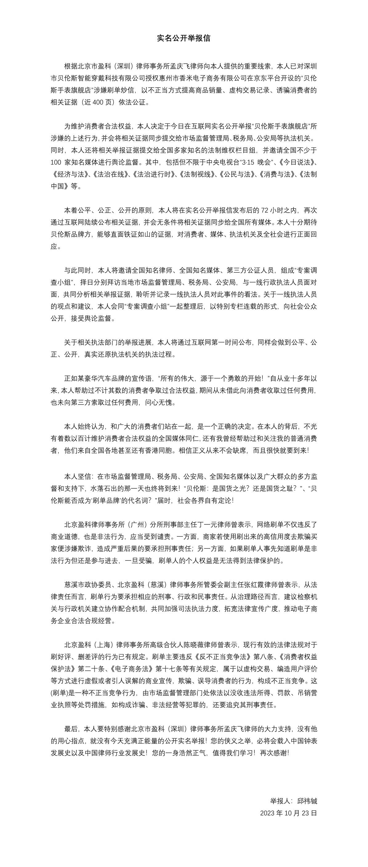 2023年10月23日,一则京东“贝伦斯手表旗舰店”涉嫌刷单炒信的“实名公开举报信”,引发了社会多方的关注。“实名公开举报信”原文如下: