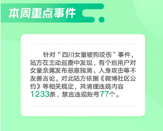 此前,10月23日,@微博管理员 通报称,针对“四川女童被狗咬伤”事件,有个别用户对女童亲属发布恶意揣测、人身攻击等不友善言论,有77个违规账号被禁言。