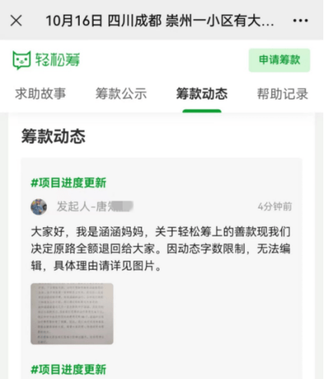 25日晚,四川被犬咬伤2岁女童涵涵的母亲邓女士也发声,表示将在轻松筹募集的捐款全额退回。