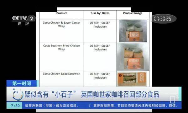 咖世家(Costa Coffee)一名发言人8日表示,被召回的产品包括部分三明治、炸鸡卷和鸡肉凯撒卷等。购买这些产品的顾客,不论是否保留有购物小票,都可以退货,并获得全额退款。英国食品标准局在一份声明中警告称,这些食品“可能存在危险,建议消费者不要食用”。