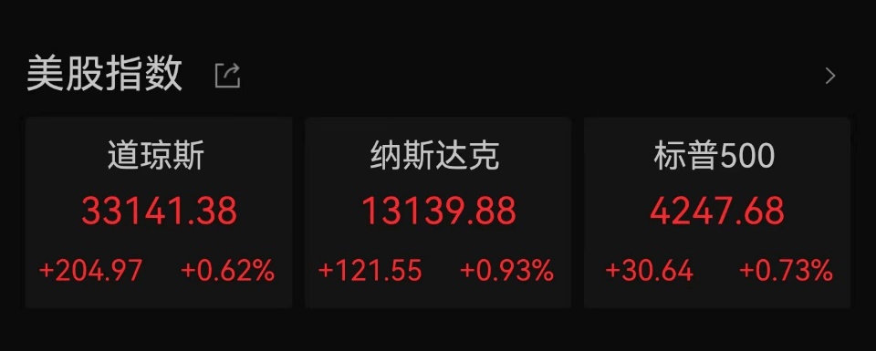 当地时间10月24日,美国三大股指全线收涨,截至收盘,道指涨0.62%报33141.38点,标普500指数涨0.73%报4247.68点,纳指涨0.93%报13139.88点。