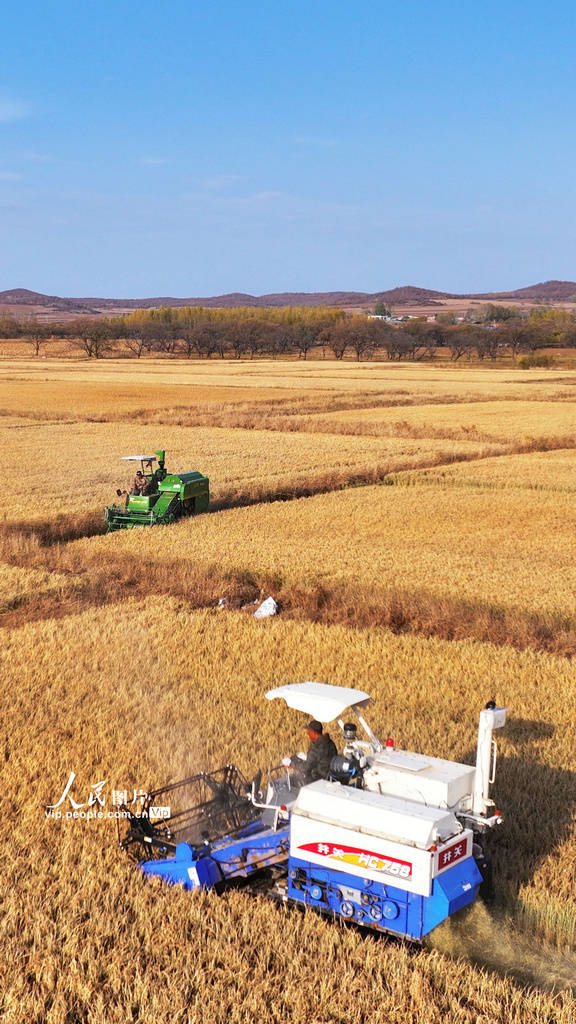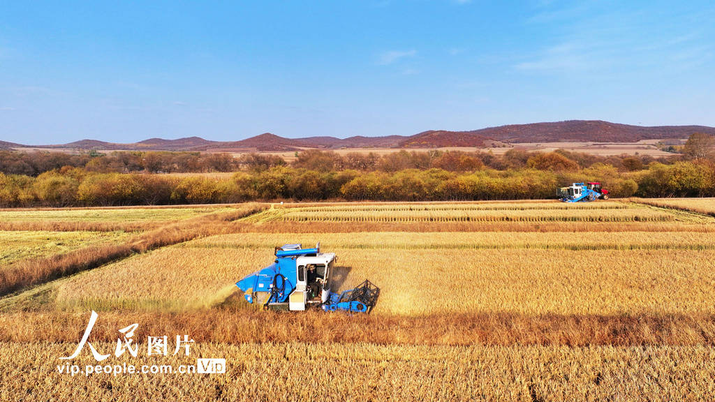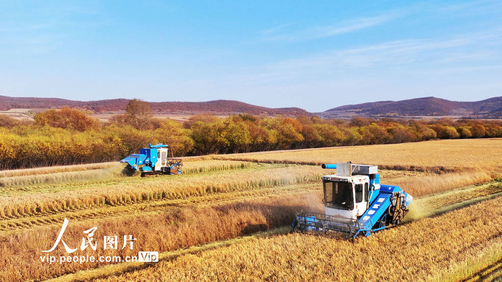 金秋十月,内蒙古自治区呼伦贝尔农垦扎兰屯农牧场黑土沃野上的秋粮丰收,农场通过机械化抢收、党员志愿服务等多项措施加紧收割,确保颗粒归仓。图为2023年10月25日,农机手驾驶联合收割机在内蒙古自治区呼伦贝尔农垦扎兰屯农牧场田间收割水稻。 韩颖群摄(人民图片网)