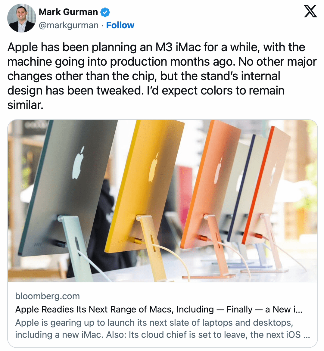 彭博社的马克・古尔曼目前在 X 平台发布贴文,声称苹果将在本次新品发布会中,推出搭载 M3 芯片的 24 寸 iMac。