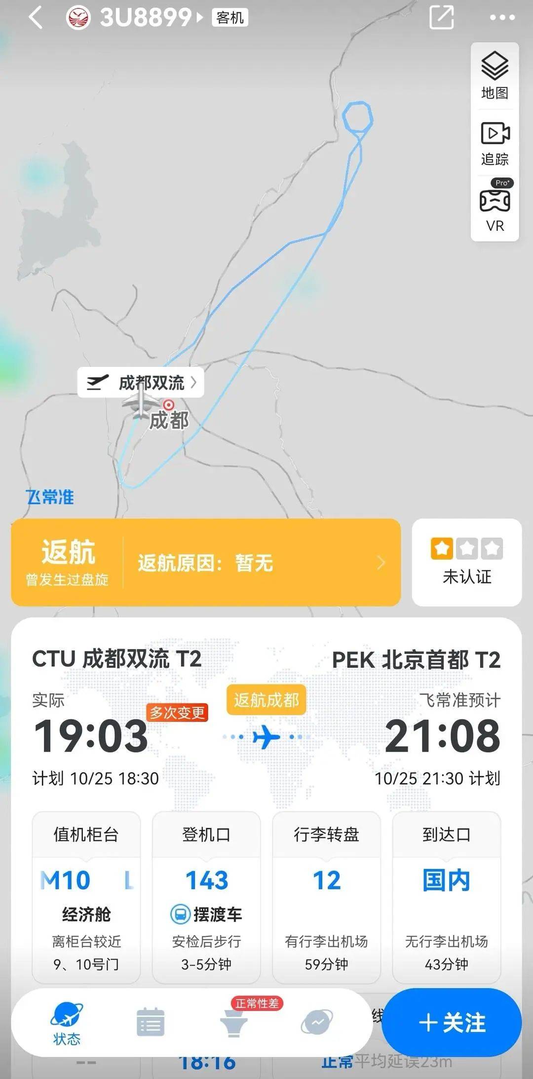 据封面新闻报道,飞常准App显示,川航3U8899由空客A321-211飞机执飞,于25日19点03分从成都双流机场起飞。该航班状态显示,返航过程中曾发生过盘旋。