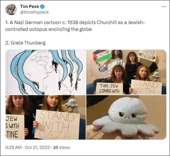 据《环球网》报道,前段时间,被外界称为“环保少女”的瑞典女孩格蕾塔,在其社交平台账号上,发布了一则声援巴勒斯坦的帖子,但是,由于身边放着一只章鱼玩偶,引起了很大的争议,被指责为用章鱼来指代“邪恶的犹太人”,最后她将只能将这个帖子进行删除。然后重新发送一则,没有章鱼的新帖。