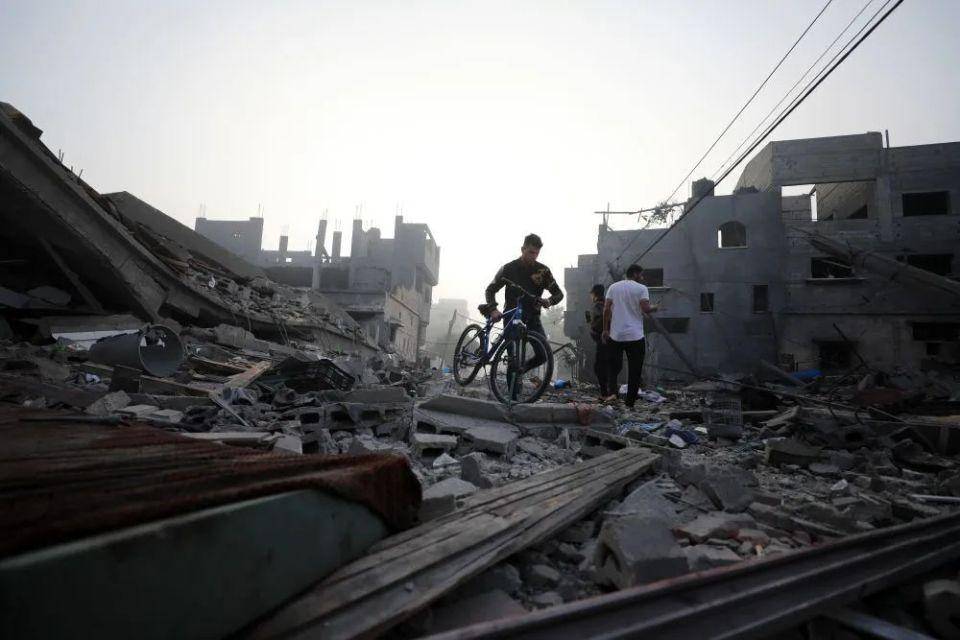 10月25日,在加沙地带南部城市汗尤尼斯,人们穿过遍布建筑瓦砾的道路。新华社发(亚西尔·库迪摄)