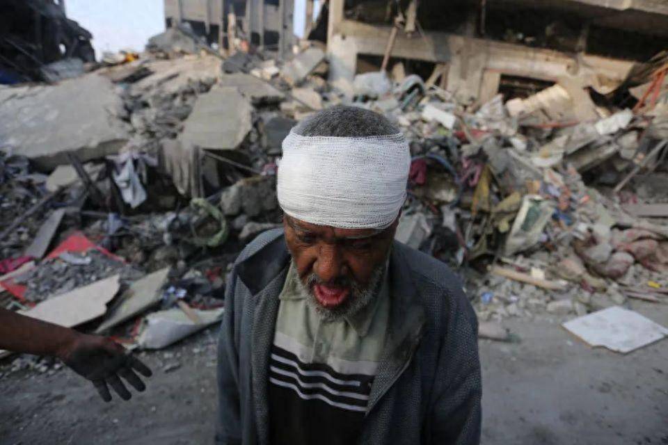 10月25日,在加沙地带南部城市拉法,一名在以色列空袭中受伤的老人头部裹着纱布。新华社发(哈立德·奥马尔摄)