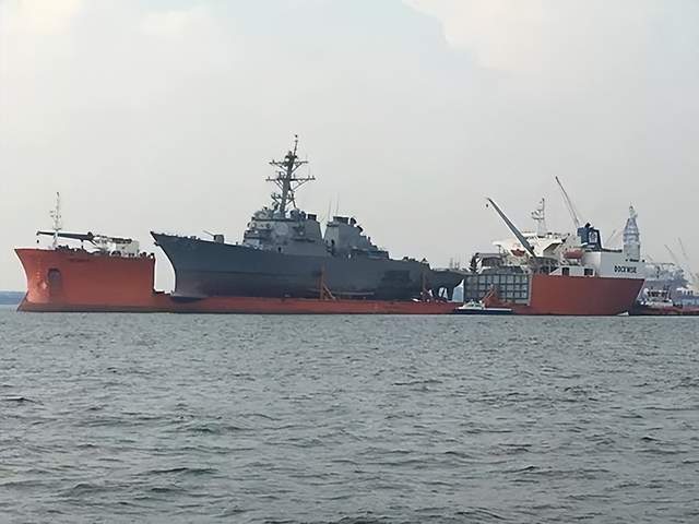 早些年,美海军“麦凯恩”号驱逐舰在新加坡与货船相撞,正准备离开新加坡由半潜船运往日本维修,有细心人士发现,这艘负责运送美军军舰的半潜船,竟然是中国制造。资料显示,当时“麦凯恩”号身上有非常明显的两处“伤口”,一处在船体侧后方,另一处船体前方水线位置,说明当时“麦凯恩”号与货船发生了至少两次碰撞。