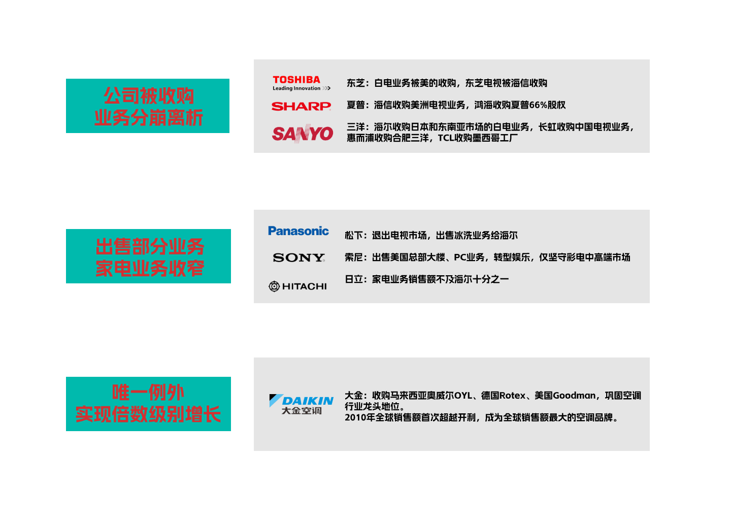 比如,东芝将电视业务出售给海信、白电业务出售给美的;夏普被鸿海收购;三洋在被松下收购后又遭肢解出售,其日本和东南亚市场白电业务被海尔收购,中国电视业务被长虹收购;松下退出电视市场,将洗冰业务出售给海尔;索尼仅坚守彩电中高端市场,家电已不再是重点业务;日立家电业务不及海尔的1/10。
