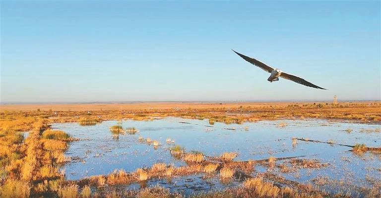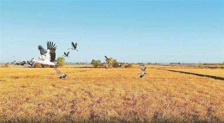 在这里,“鸟中国宝”东方白鹳成群结队,时而在水中捕虫嬉戏,时而翱翔于碧蓝的天空。