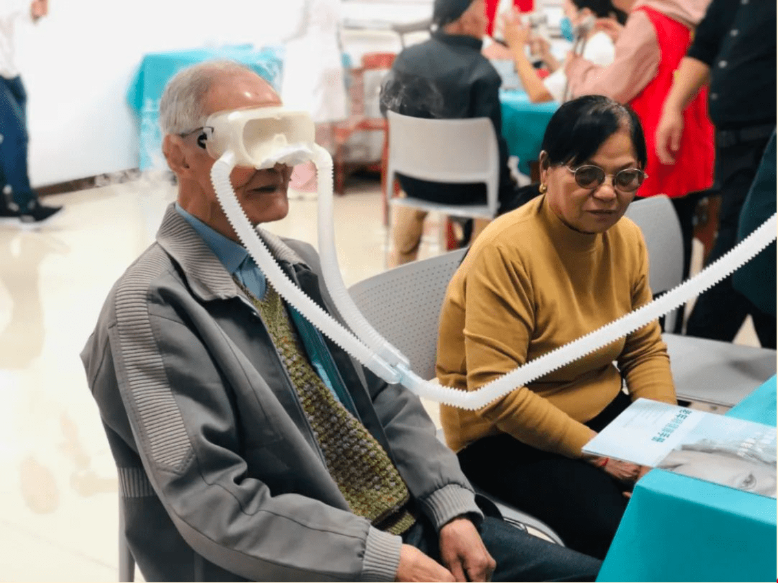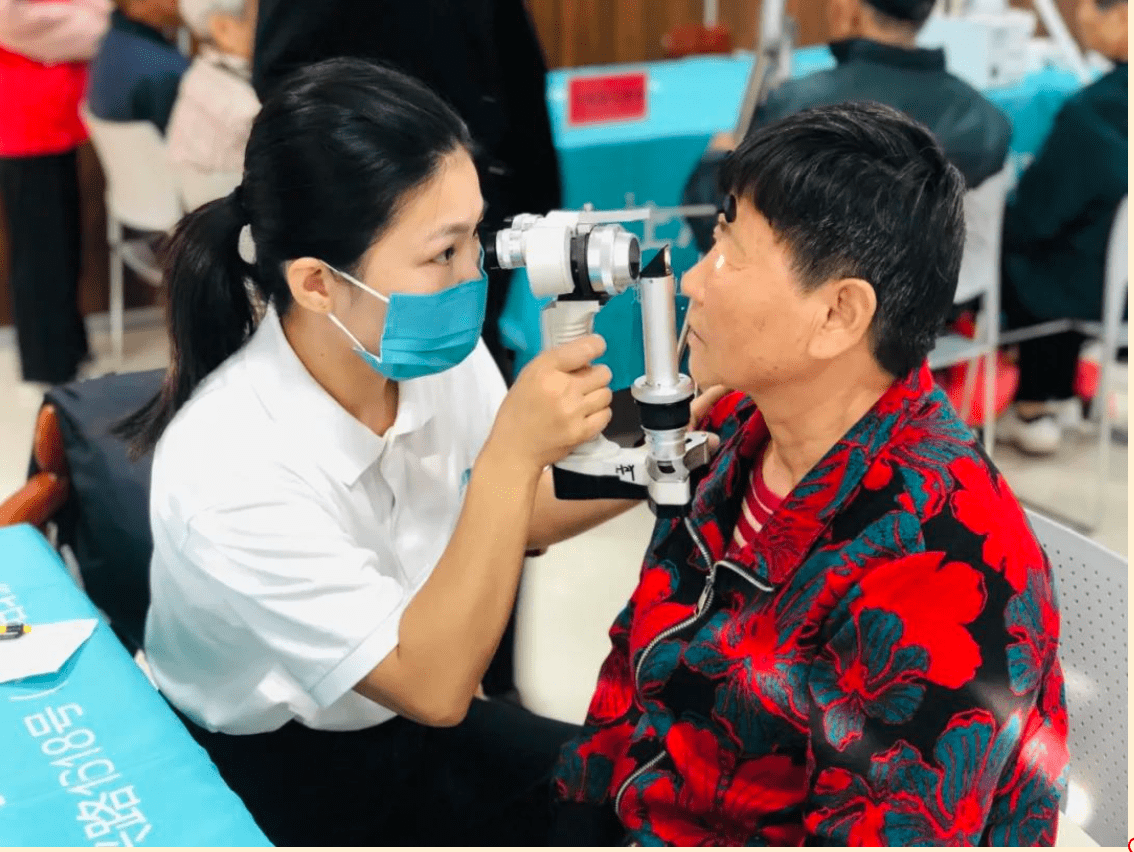 在义诊现场,农场居民早早地排起长龙等待检查,医护人员为前来问诊的老人进行详细检查,针对白内障、干眼症、翼状胬肉等常见眼病进行现场答疑解惑,并为需要治疗的患者讲解了治疗过程和注意事项,有干眼症状的老人在现场还体验了干眼雾化熏蒸项目。