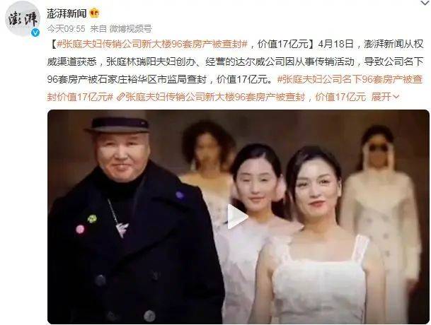 据澎湃新闻官方微博,2022年4月18日从权威渠道获悉,张庭林瑞阳夫妇创办、经营的达尔威公司因从事传销活动,导致公司名下96套房产被石家庄裕华区市监局查封,价值17亿元。