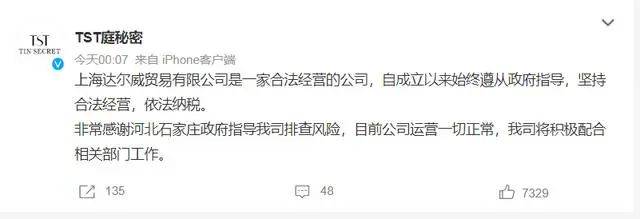 而对于“TST庭秘密”因涉嫌传销被调查一事,“TST庭秘密”曾在2021年12月29日凌晨发布微博称,上海达尔威贸易有限公司是一家合法经营的公司,自成立以来始终遵从政府指导,坚持合法经营,依法纳税。非常感谢河北石家庄政府指导我司排查风险,目前公司运营一切正常,我司将积极配合相关部门工作。