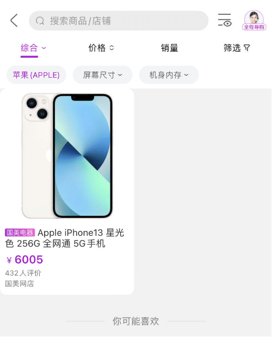 例如,手机模块的所列品牌中,并没有华为的身影,而点击“苹果”后,搜索结果显示只有“iphone13”一款型号出现在国美APP的在售列表。