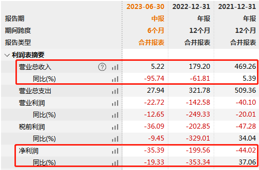 wind数据显示,国美零售2021年、2022年及2023年上半年的营业收入分别为469.26亿元、179.2亿元、5.22亿元,同比增速分别为5.39%、-61.81%、-95.74%;净利润为-44.02亿元、-199.56亿元、-35.39亿元,同比增速分别为37.06%、-353.34%、-19.33%。前述业内人士分析表示,创始人黄光裕出狱后对国美制定的一系列决策反而让公司倒下得越来越快。
