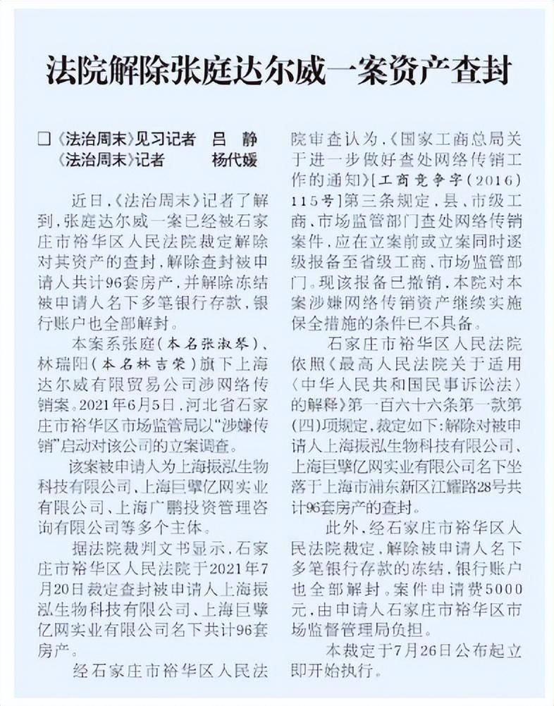 报道显示,本案系张庭(本名张淑琴)、林瑞阳(本名林吉荣)旗下上海达尔威有限贸易公司涉网络传销案。2021年6月5日,河北省石家庄市裕华区市场监管局以“涉嫌传销”启动对该公司的立案调查。