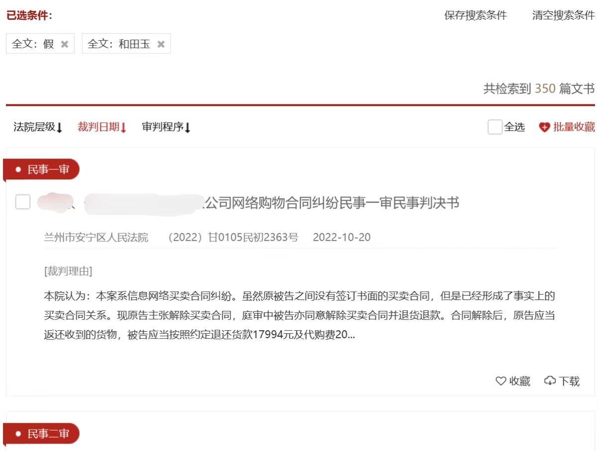 以“假”“和田玉”为关键词搜索,共有350起相关案件。图/中国裁判文书网