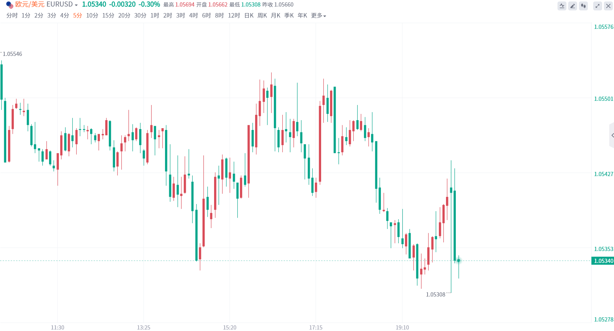 利率决议公布后,欧元兑美元短线小幅走低十余点,现报1.0534。