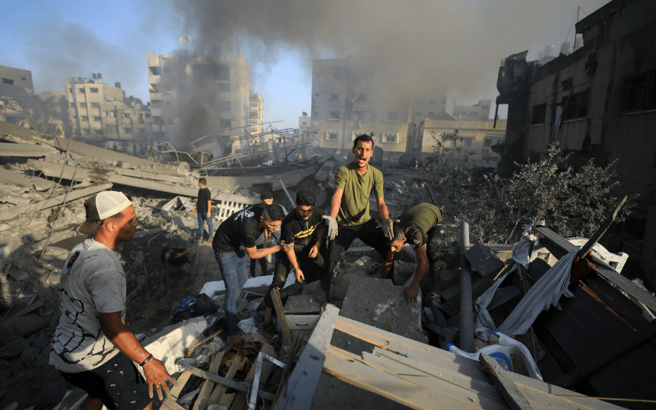 10月25日,加沙城,人们在建筑废墟中搜寻伤者。图/新华社