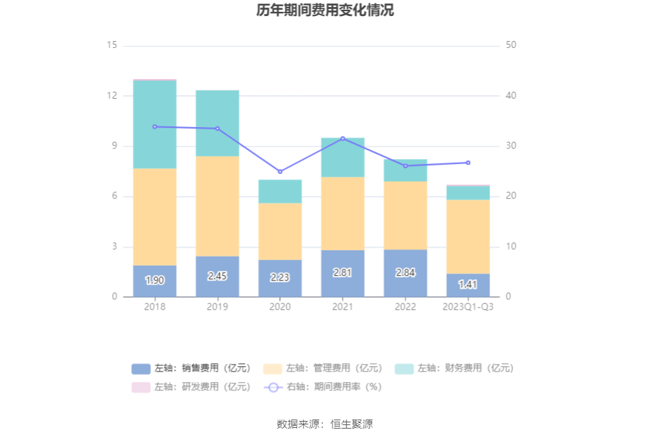 2023年前三季度,公司期间费用为6.71亿元,较上年同期增加9151.17万元;期间费用率为26.76%,较上年同期上升1.91个百分点。其中,销售费用同比下降20.23%,管理费用同比增长44.11%,研发费用为690.57万元,财务费用同比下降14.76%。