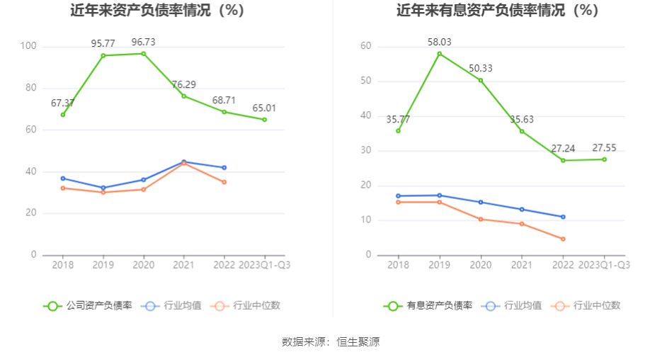 在偿债能力方面,公司2023年三季度末资产负债率为65.01%,相比上年末下降3.73个百分点;有息资产负债率为27.55%,相比上年末上升0.31个百分点。