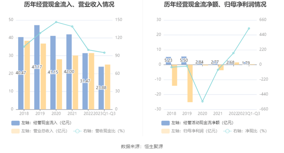 2023年前三季度,公司营业收入现金比为95.24%,净现比为536.57%。