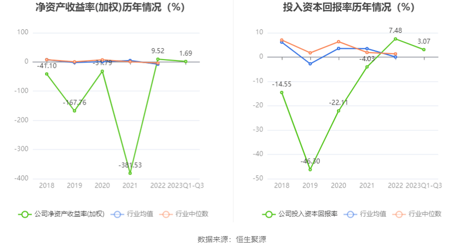 数据显示,2023年前三季度公司加权平均净资产收益率为1.69%,较上年同期下降5.31个百分点;公司2023年前三季度投入资本回报率为3.07%,较上年同期下降2.34个百分点。