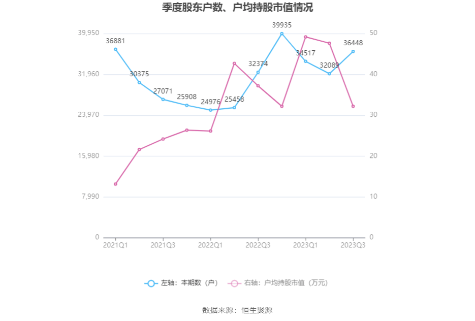 筹码集中度方面,截至2023年三季度末,公司股东总户数为3.64万户,较上半年末增长了4359户,增幅13.58%;户均持股市值由上半年末的47.63万元下降至32.20万元,降幅为32.40%。