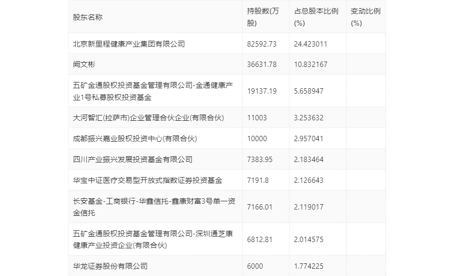 三季报显示,2023年三季度末公司十大流通股东中,持股最多的为北京新里程健康产业集团有限公司,占比24.42%。十大流通股东名单相比2023年半年报维持不变。在具体持股比例上,华宝中证医疗交易型开放式指数证券投资基金持股有所上升,五矿金通股权投资基金管理有限公司-金通健康产业1号私募股权投资基金、大河智汇(拉萨市)企业管理合伙企业(有限合伙)、五矿金通股权投资基金管理有限公司-深圳通芝康健康产业投资企业(有限合伙)持股有所下降。