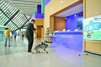 10月26日,观众在杭州拱墅运河体育公园体育场大厅体验电子导盲犬“小西”。新华社记者 黄宗治摄