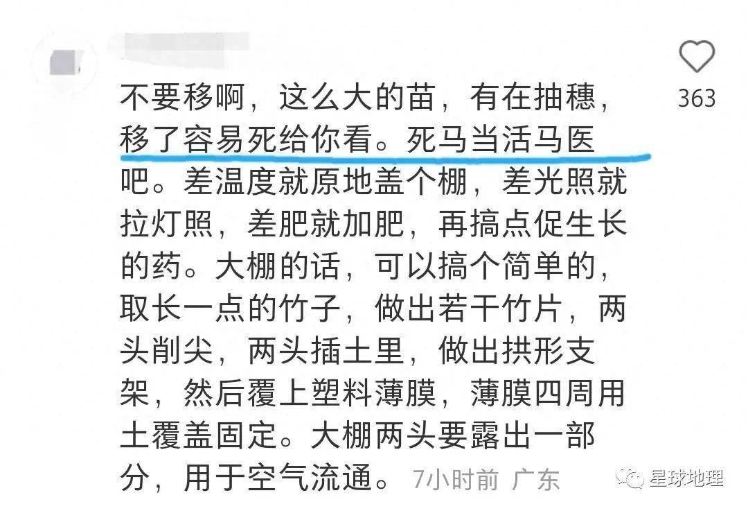 但广东一位网友说千万不要灌水,因为湖北温度现在在变低,灌水容易冻死苗,土壤保持湿润就够了,可以把它当旱稻种,没有水才能保暖;另外,不要移苗,苗都抽穗了,移了就会死给你看;可以在原地盖个简单的棚,然后覆上塑料薄膜,再就是差光照就拉灯照,差肥就加肥,再搞点促生长的药。