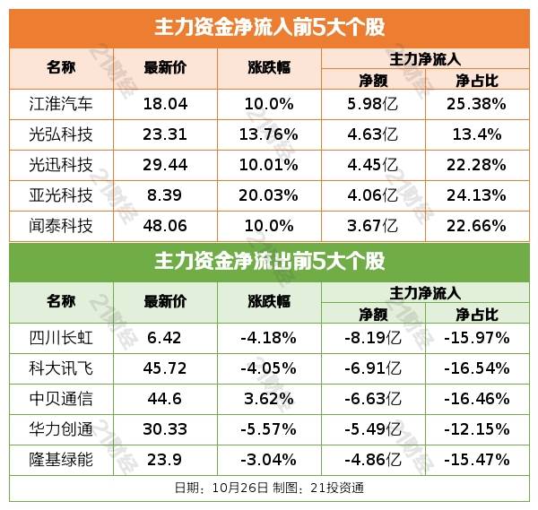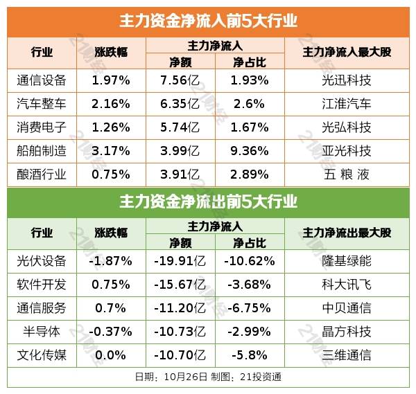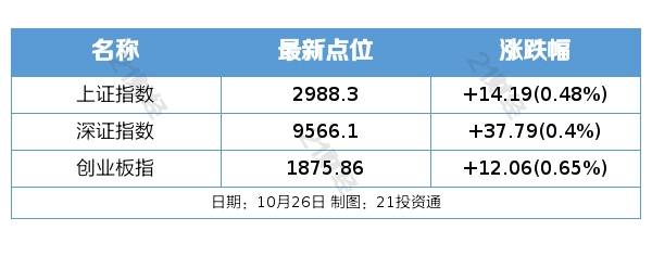 10月26日,大盘全天探底回升,创业板指领涨,盘中一度再创年内新低。截至收盘,沪指涨0.48%,深成指涨0.4%,创业板指涨0.65%。盘面上,卫星导航概念股午后持续爆发,亚光科技、天银机电、龙洲股份等涨停。汽车产业链表现活跃,华为汽车方向领涨,鹏翎股份、聚赛龙、江淮汽车、佛山照明等近10股涨停。AI概念股尾盘反弹,CPO方向领涨,光迅科技涨停。电力股震荡反弹,豫能控股涨停。下跌方面,光伏、锂矿等新能源赛道股一度陷入调整,通威股份、融捷股份跌超5%。总体上个股涨多跌少,两市超2700只个股上涨。沪深两市成交额8425亿,较上个交易日缩量312亿。板块方面,华为汽车、卫星导航、一体化压铸、液冷服务器等板块涨幅居前,煤炭、房地产、BC电池、水泥等板块跌幅居前。